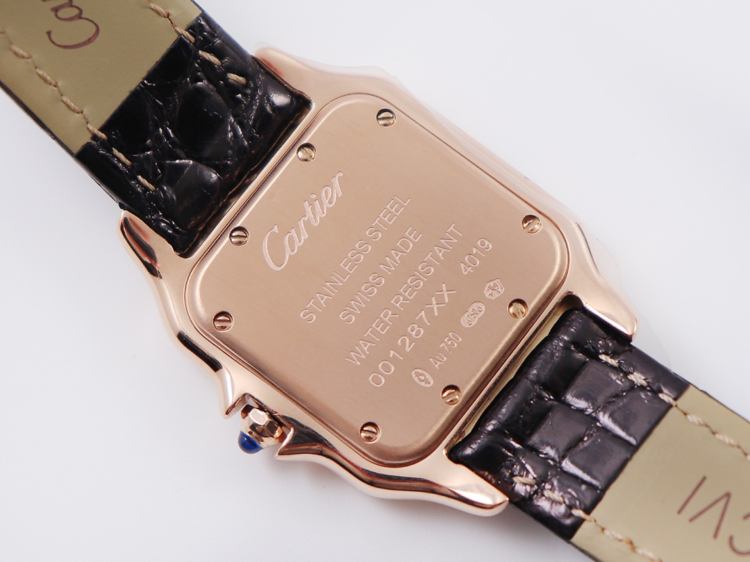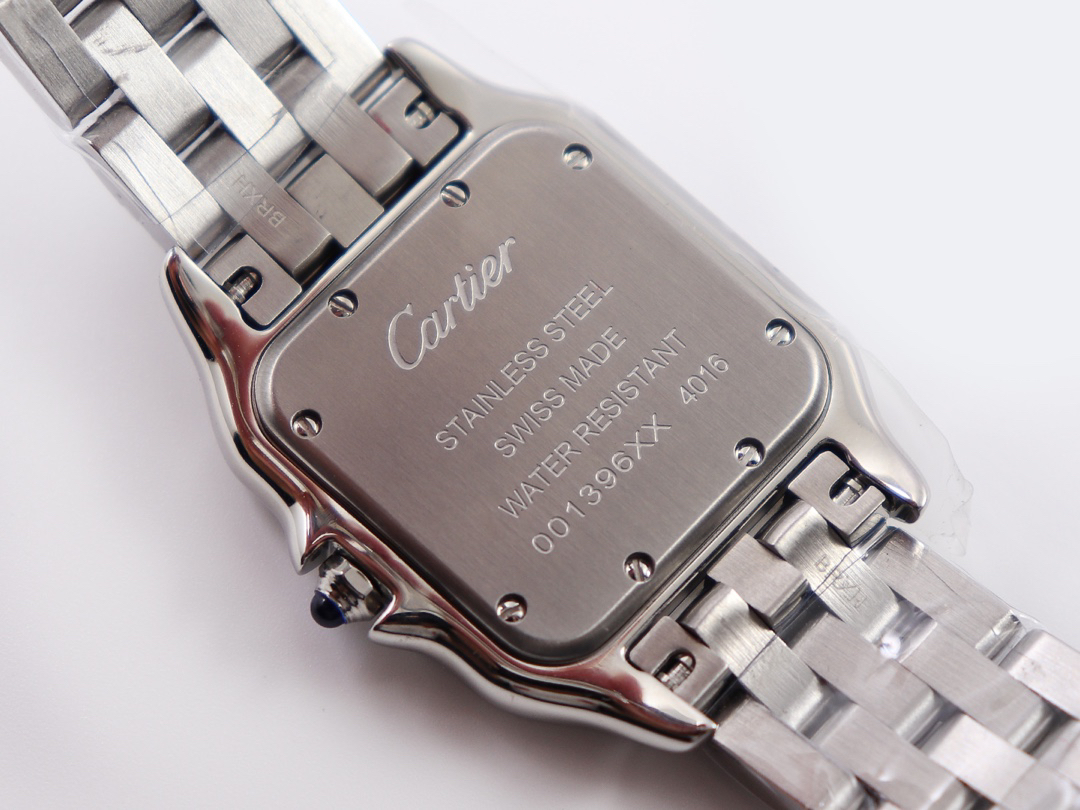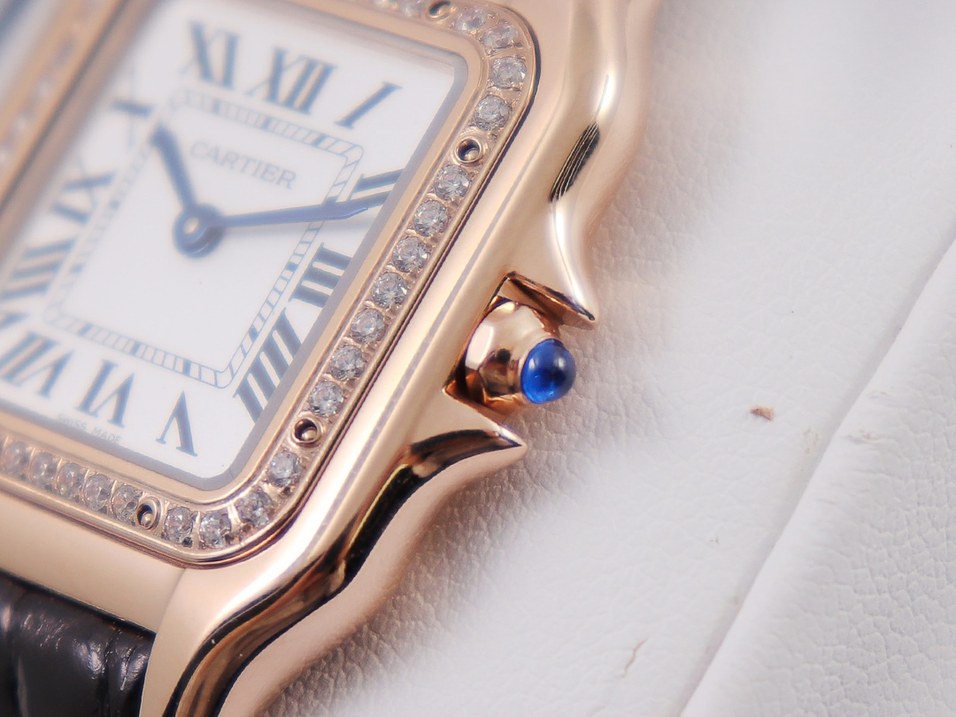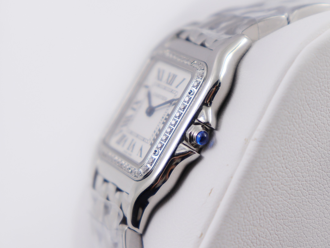 The watch features a unibody case, a Swiss quartz movement, a 316L stainless steel case, diamond-set crown with a synthetic blue spinel, silver-plated dial, blued steel sword-shaped hands, 100% water resistant to three degrees, and comes in two sizes: 27 x 37 mm and 22 x 30 mm.