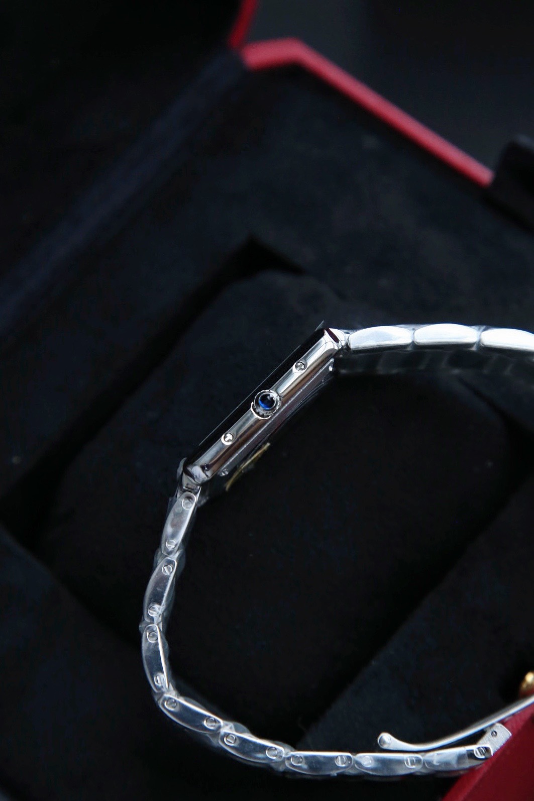 Medium size 33.7mm x 25.5mm, Small size 29.5mm x 22mm. Features a silver-plated dial, blued steel sword-shaped hands, sapphire crystal, and a unique blue spinel set on the crown. The grained calfskin strap is also noteworthy.