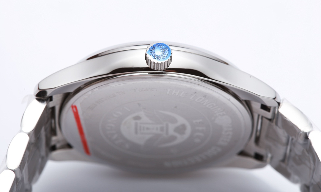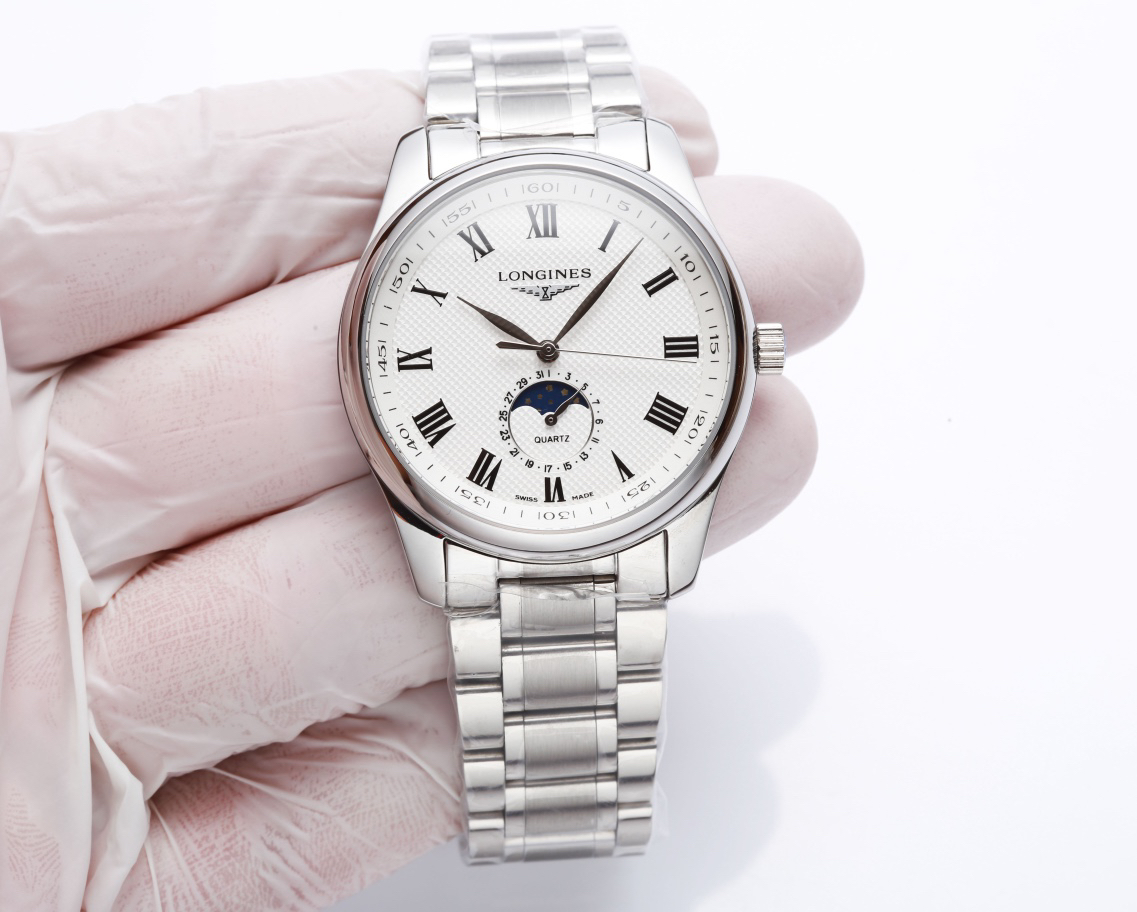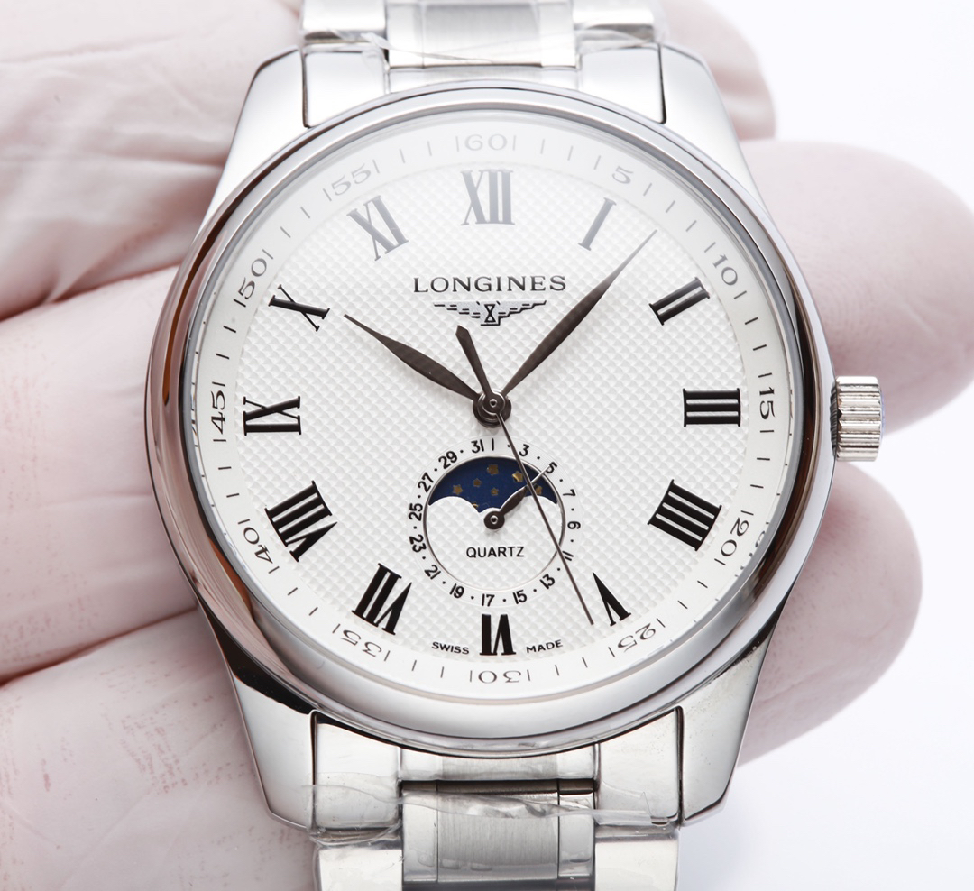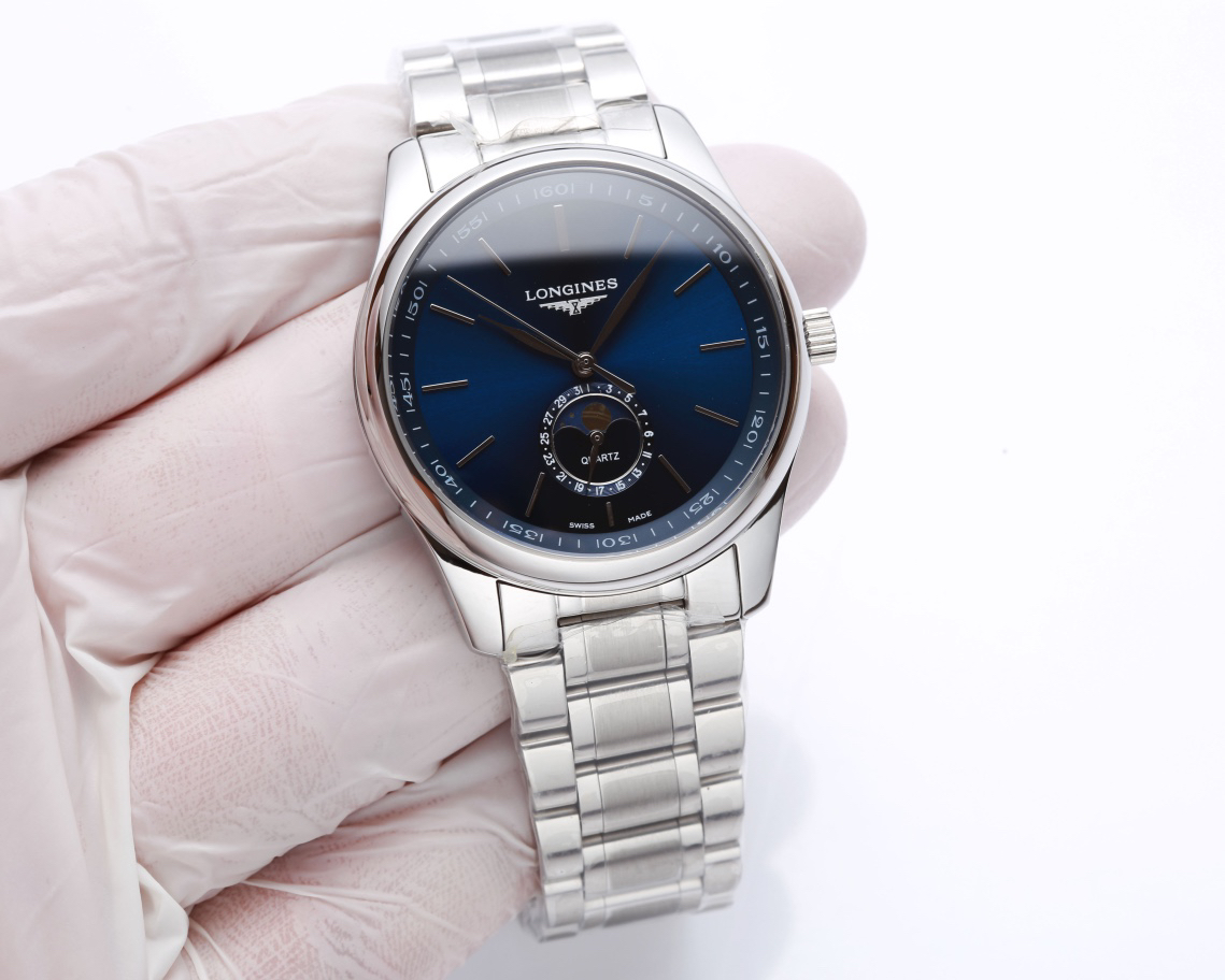 Stainless steel case, moon phase quartz movement, leather strap, sapphire crystal.
