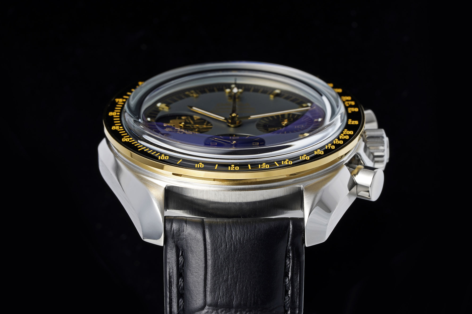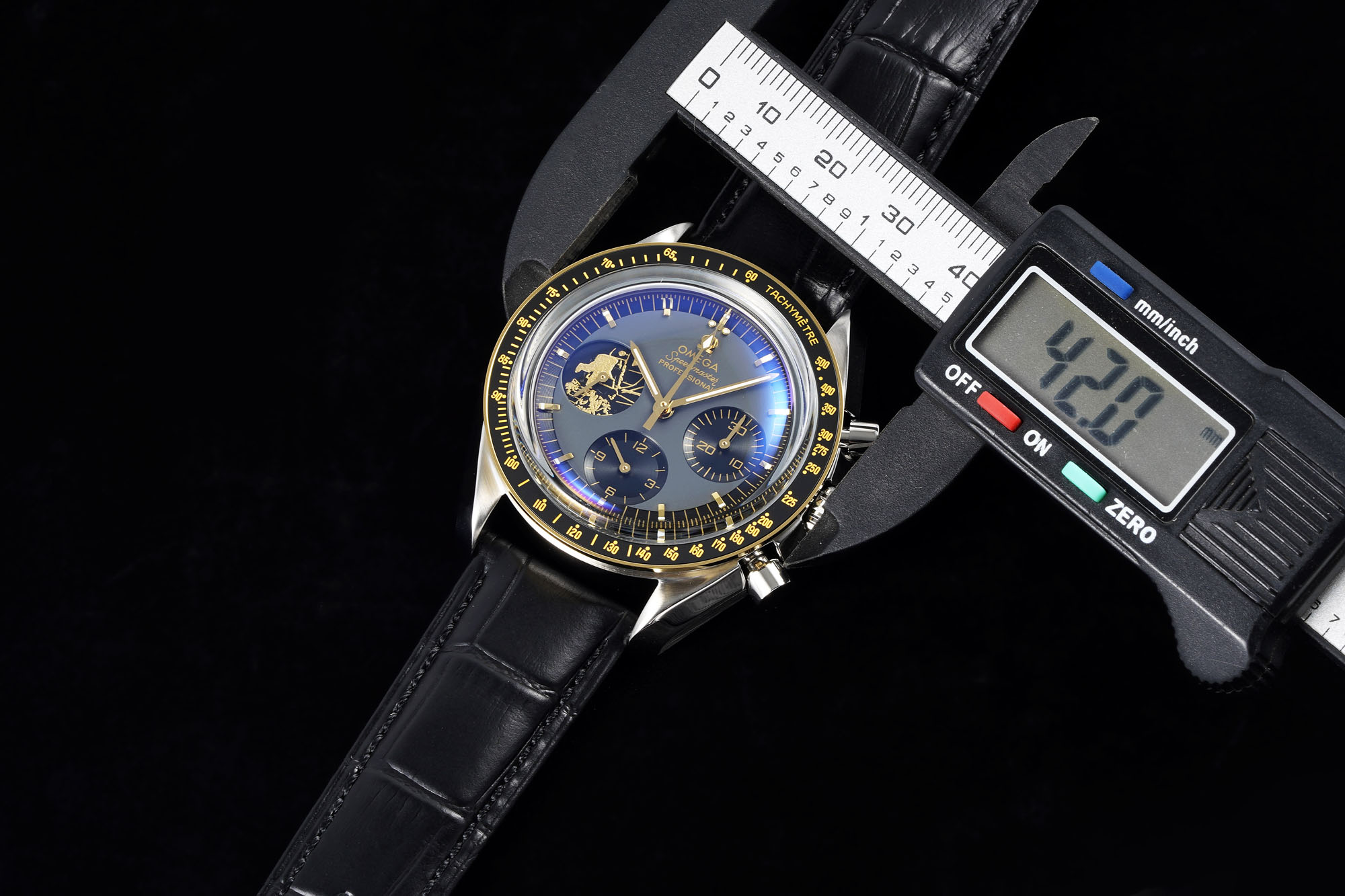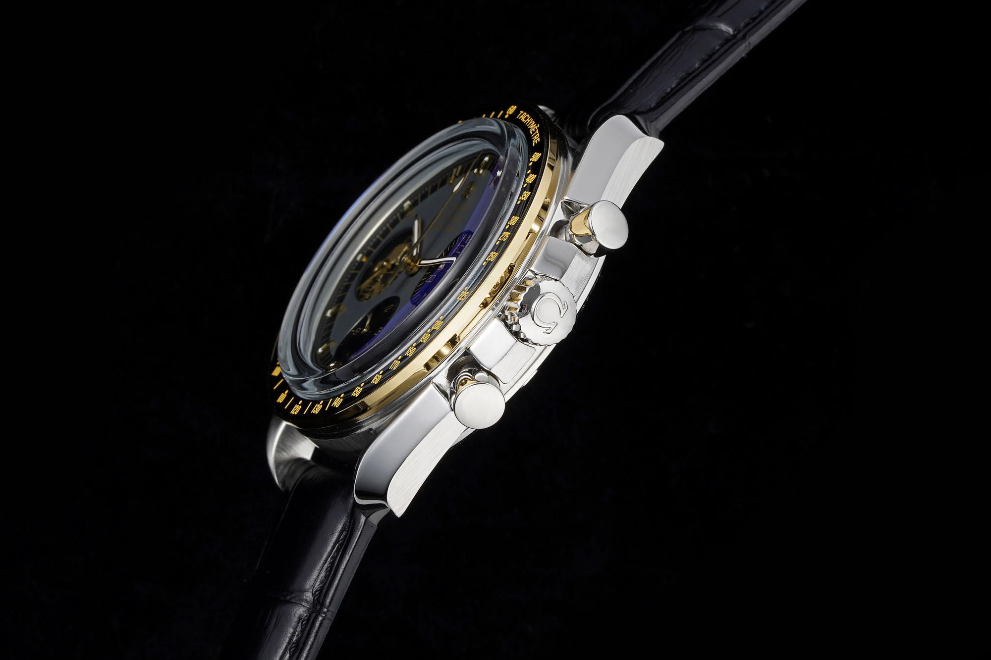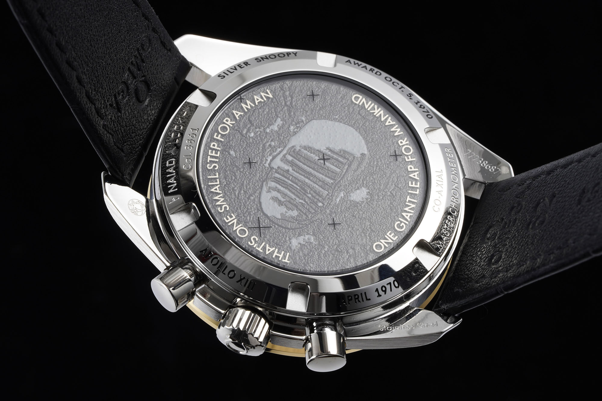 [Case] The case back features NAIAD clasp technology to ensure the engraved lettering remains in the correct position. The badge beneath the sapphire crystal case back is laser-engraved with astronaut Armstrong's lunar footprint.