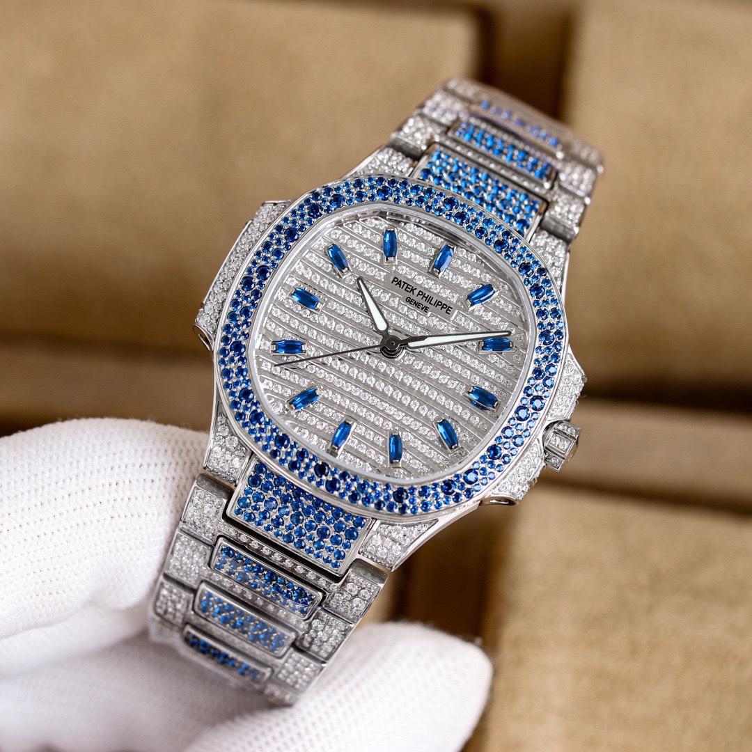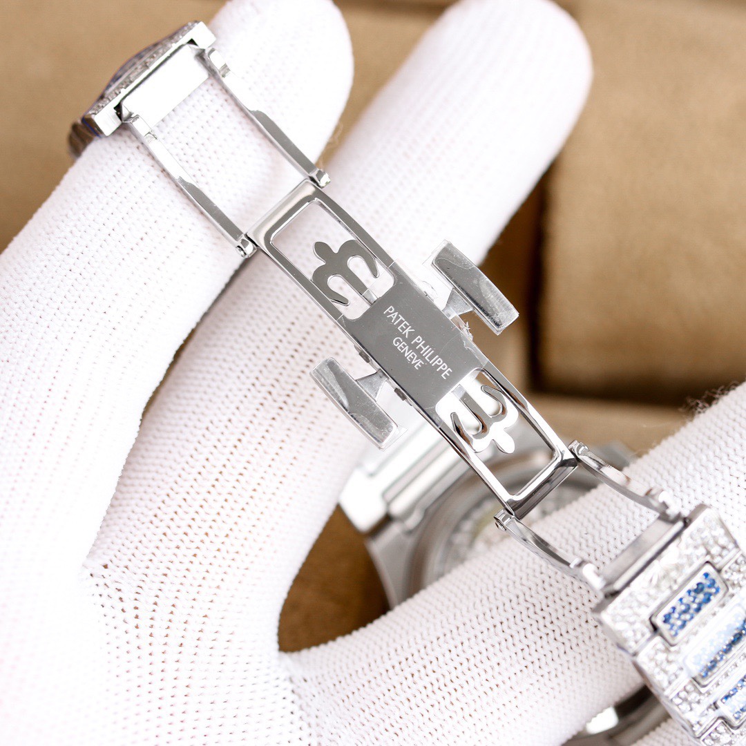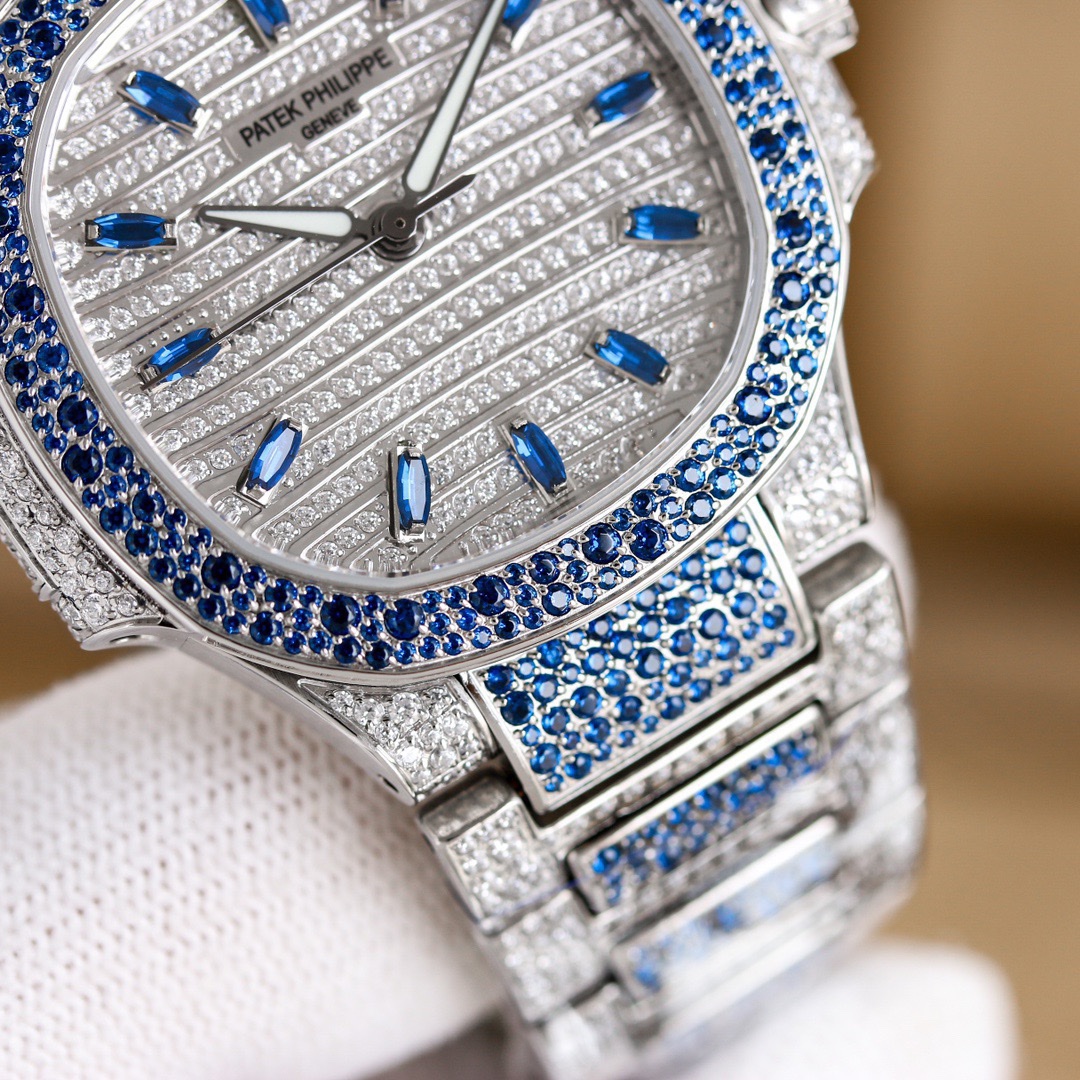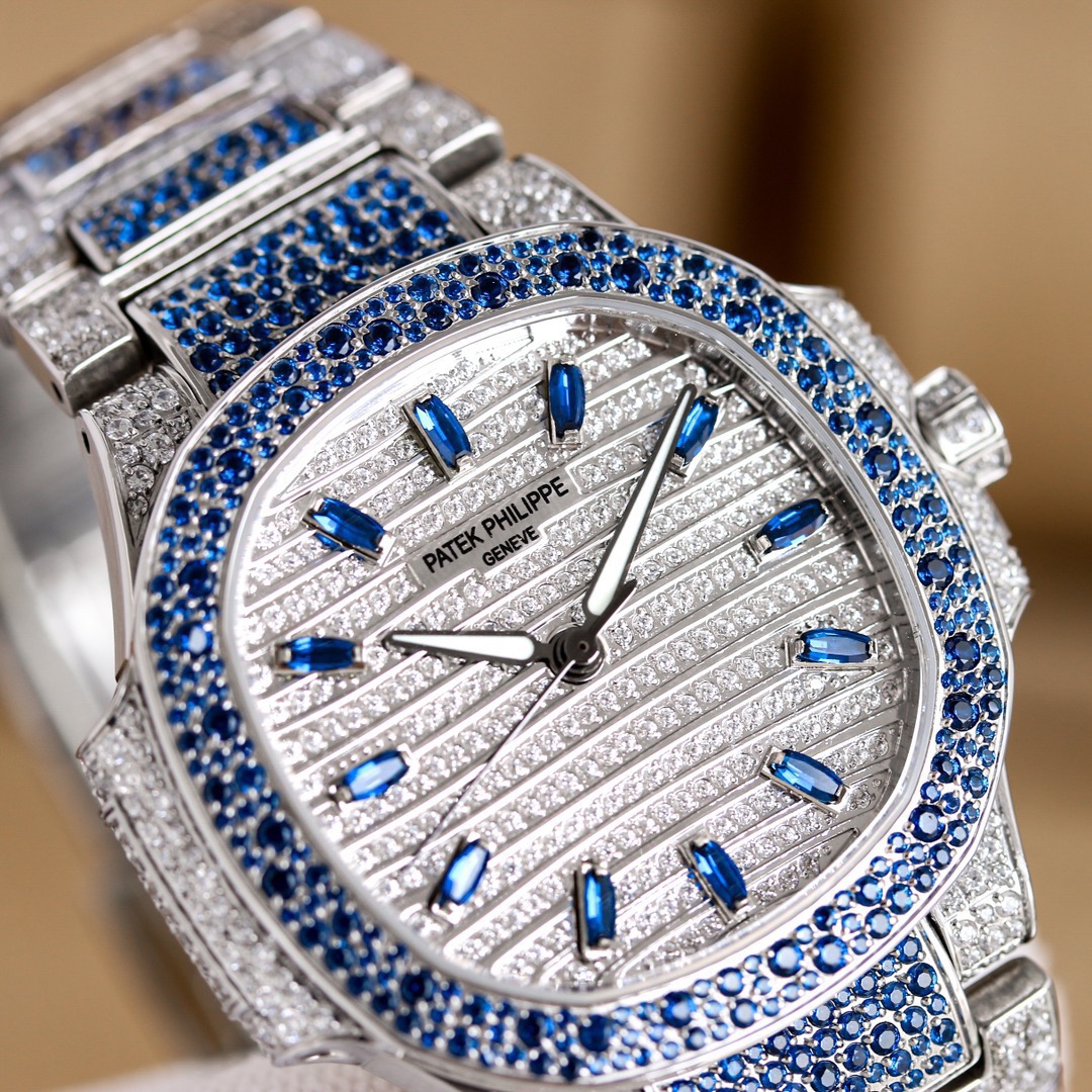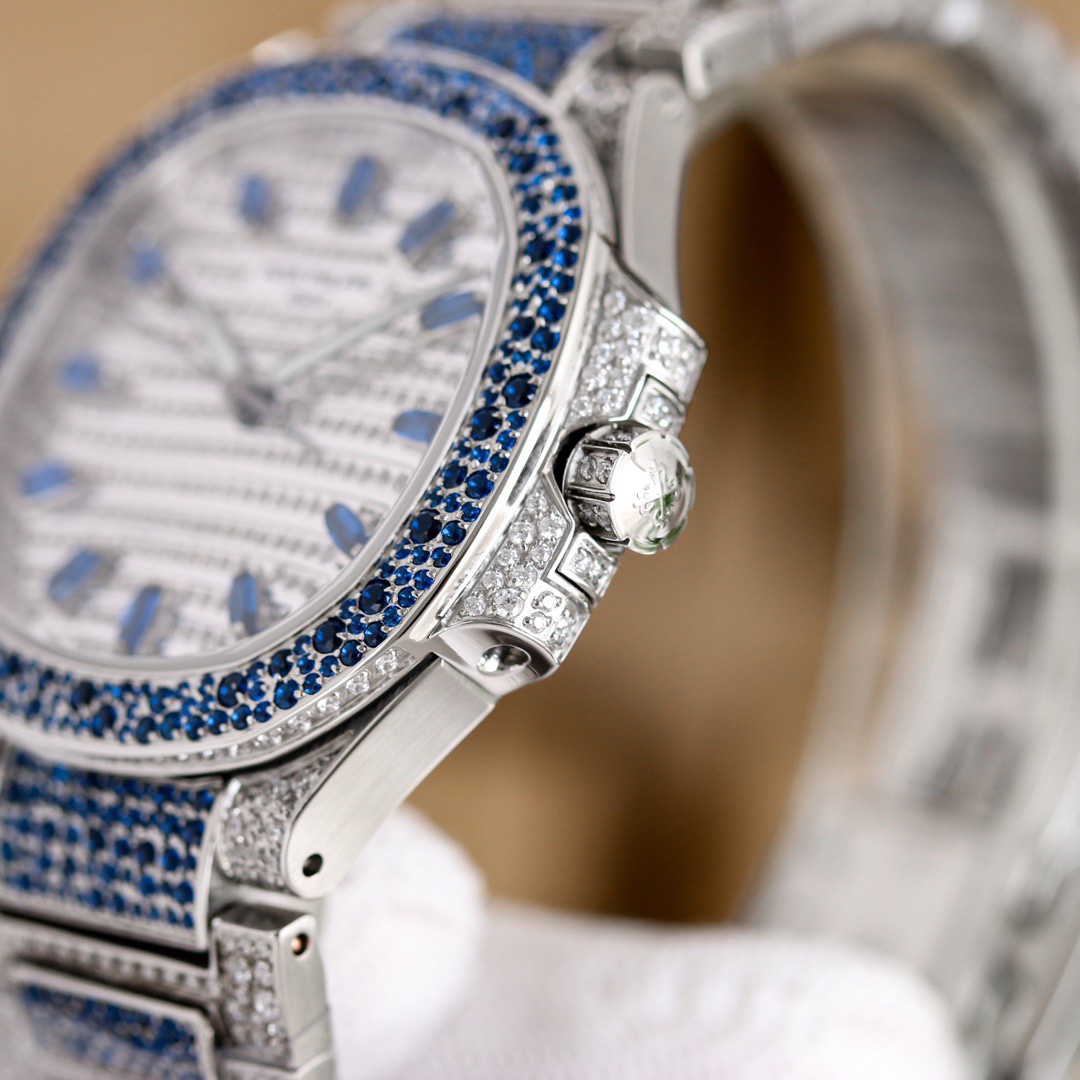 Case and strap: 1,500 brilliant-cut rhinestones and 876 brilliant-cut ruby, sapphire, and emerald rhinestones are set using the rare "snowflake setting" technique, adding to the watch's brilliance. This technique involves setting and securing diamonds of varying sizes, minimizing any trace of precious metal.